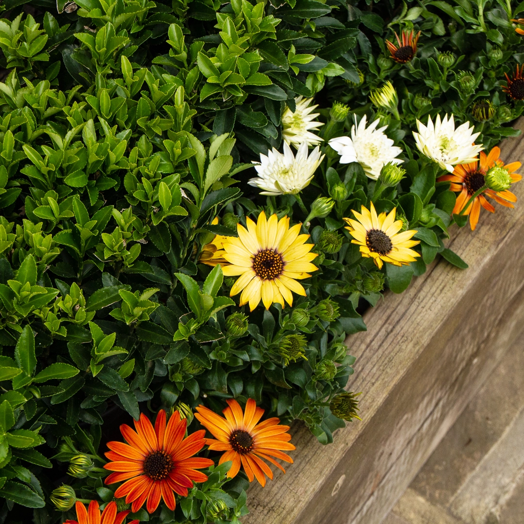 Osteospermum has a compact habit with a mass of orange flowers that open when the sun is out and close up at night.