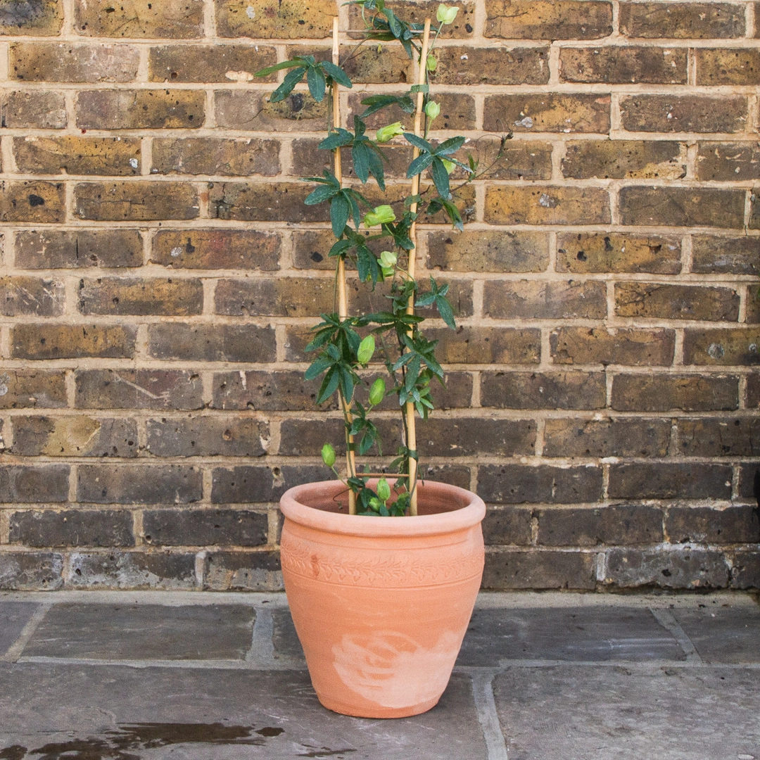 Add that tropical touch to a south-facing wall in your garden with this elegant white flowering species of Passionflower. The showy white flowers have striking central filaments in shades of blue, purple and white. Passion flowers are native to the Neotropical realm of Central and South America where they can be naturally found thriving in mountain and rainforest environments. Peachy-coloured edible fruits in autumn but not very tasty! A useful semi-evergreen climber that is fast growing and will provide your garden with months of summer blooms.