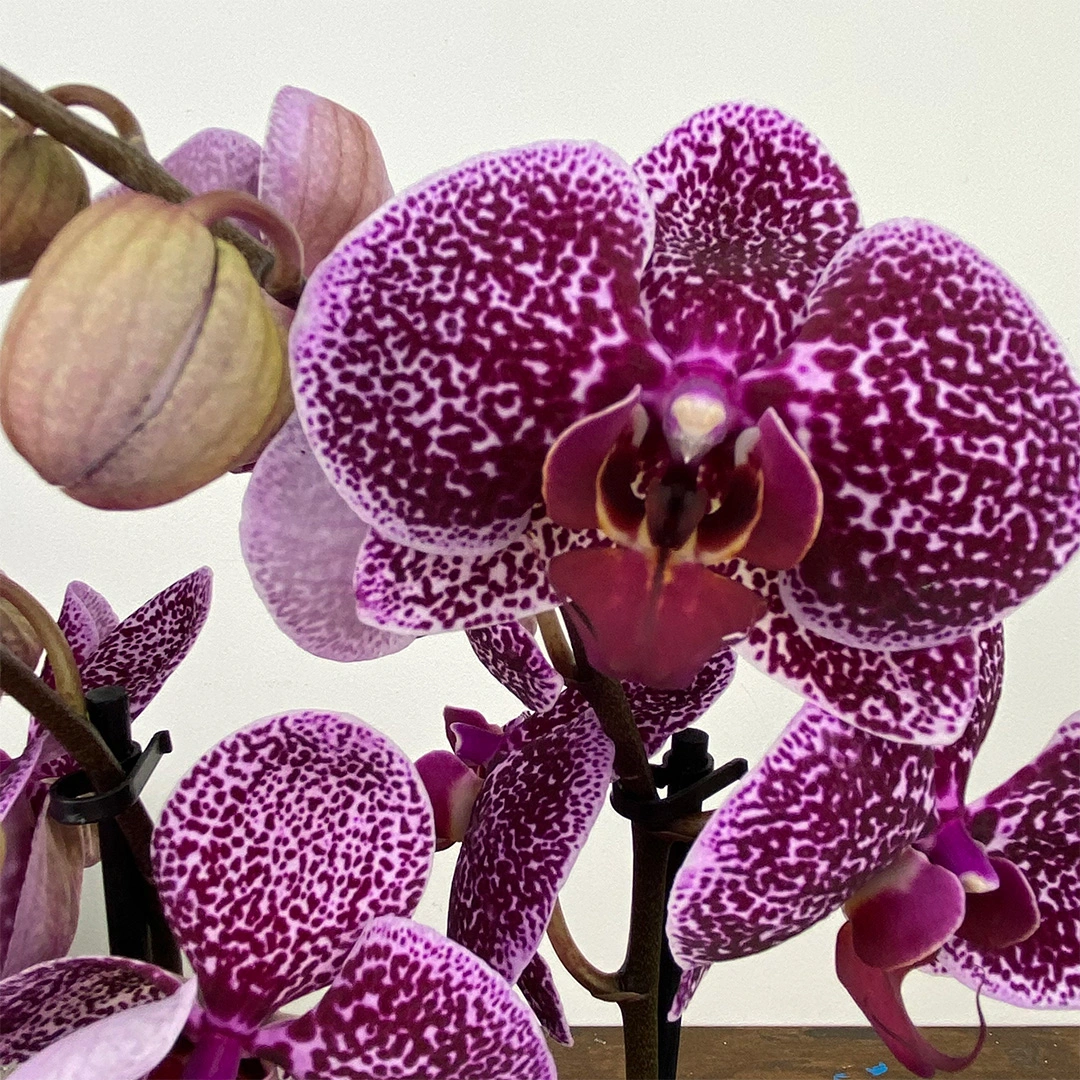 Phalaenopsis 'Jaguar' is a stunning variety; with gorgeous purple spotted flowers and cascading flower spikes that bloom for long periods, this orchid always puts on a show. For an extra helping hand, you can feed in spring/ summer with specific flowering/ foliage feeds.