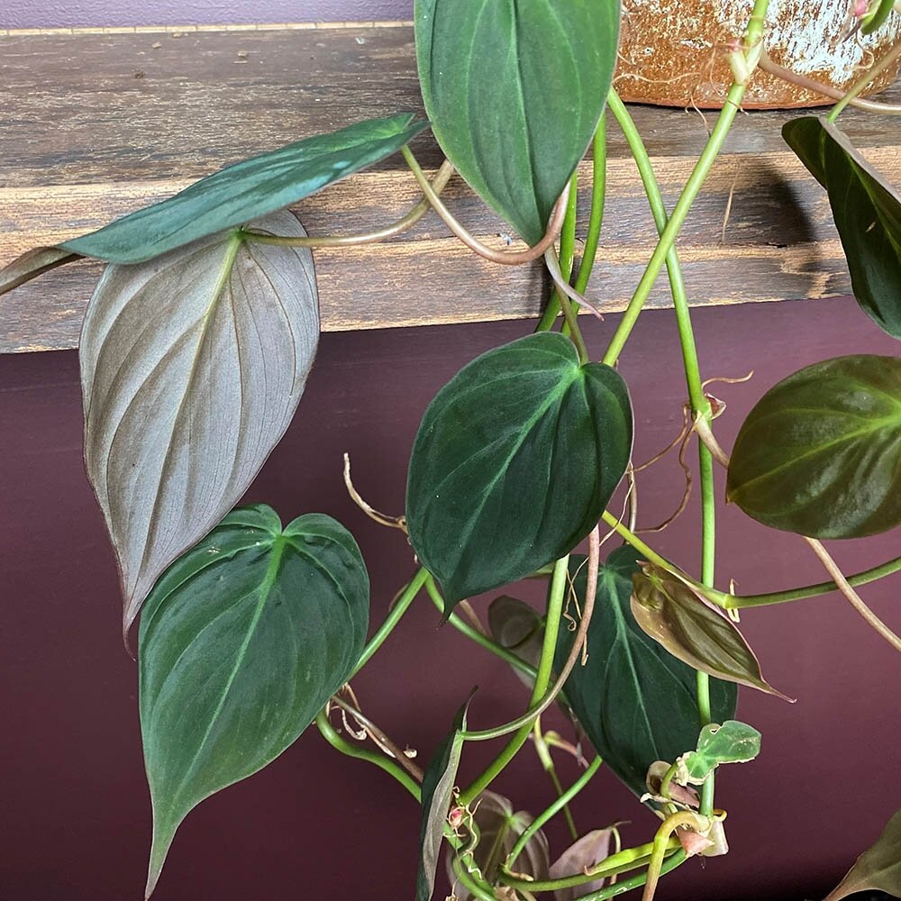 Philodendron 'Micans' is a stunning houseplant. Its elongated heart-shaped leaves, regal coloured foliage and ability to tolerate low light levels make this a very popular variety. This beautiful Philodendron is a great addition to any household and will thrive if kept in indirect light, free-draining soil and fed regularly throughout the summer months. Philodendron can be quite cold-sensitive so avoid windowsills and conservatories in winter months or you may start to see black cold damage marks on the foliage. As Micans is a trailing Philodendron, it makes the perfect plant for high up places or feature hanging plants.