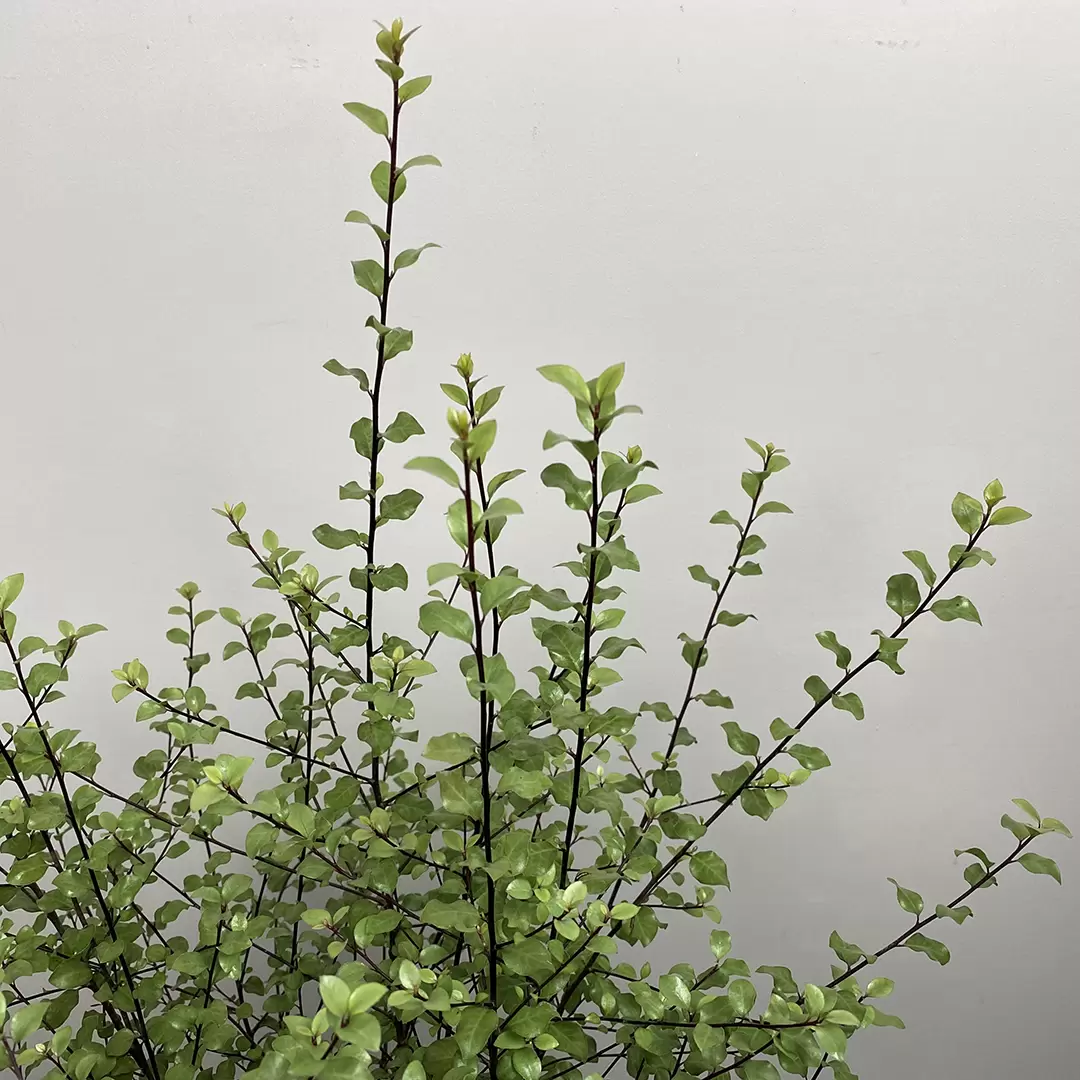 Upright evergreen shrub with glaucous foliage against black stems. Pittosporum tenuifolium 'Green Elf' looks excellent when planted with shrubs with contrasting foliage colours. Its leaves are smaller than other Pittosporum Tenuifolium varieties. Suitable for creating a hedge.