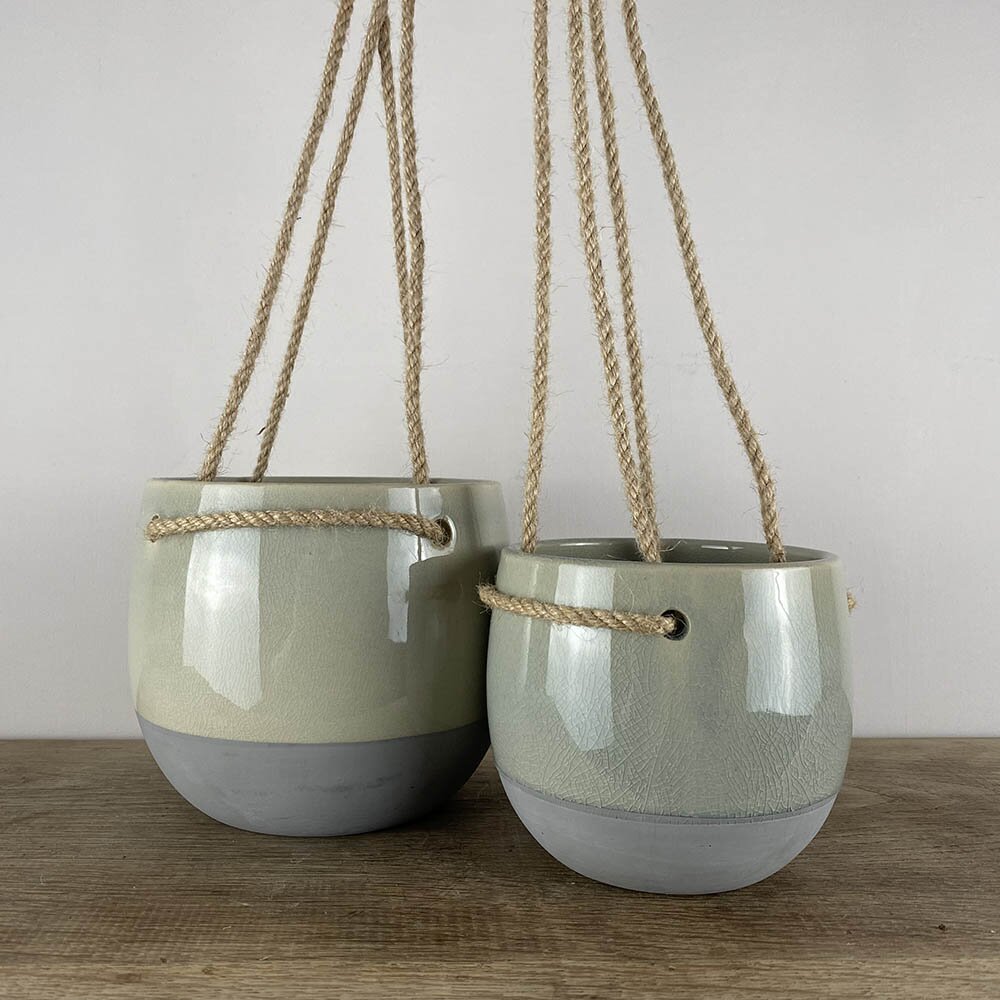A grey hanging indoor plant pot cover, with a crazed glazed finish painted over a grey matt base, the Resa series comes in grey and green colours. Kiln fired twice for high durability, and lightweight makes it ideal for hanging.
