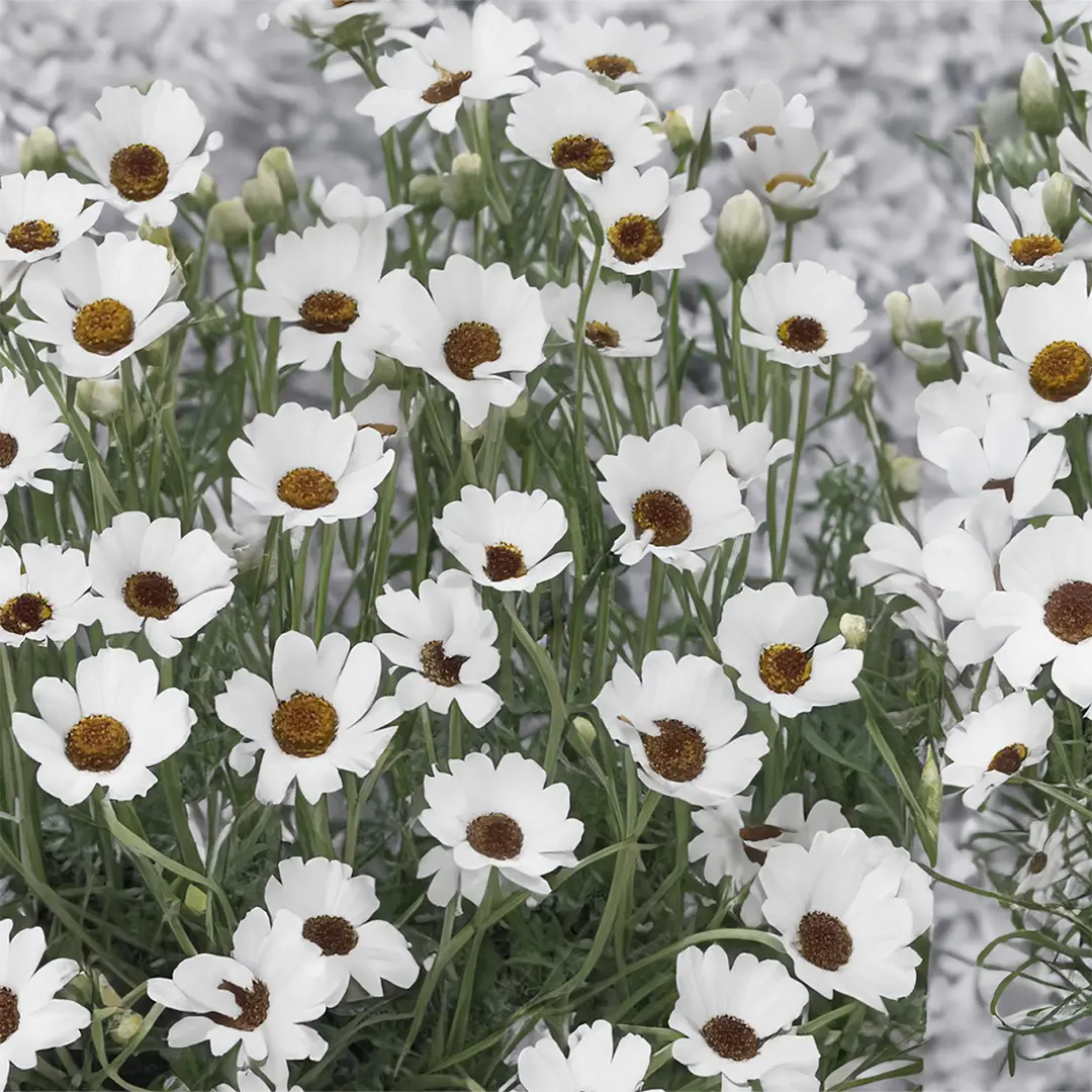 - Silvery foliage, white daisy flowers