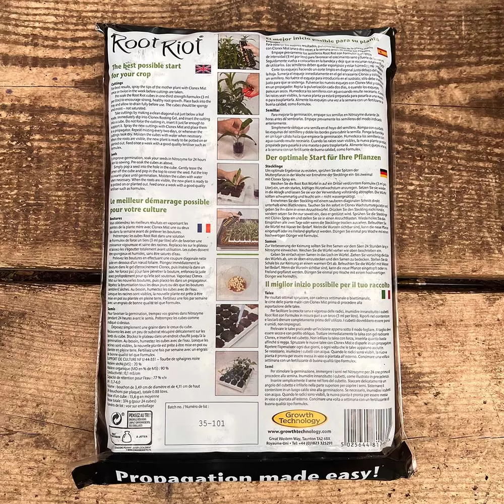 These root blocks are ideal for sowing seeds or striking young cuttings. The rooting blocks provide a complete growing media to encourage faster initial root development and subsequent root growth. Root Riot blocks help with moisture control, preventing dampening off and rotting of young seedlings and cuttings. Root blocks contain a fine blend of micronutrients to allow your young plants to thrive.