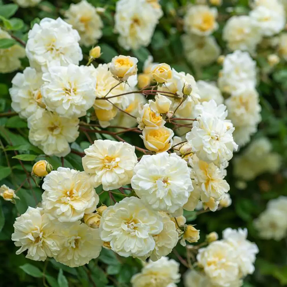 - Rambling rose with double yellow blooms that repeat flowers throughout the season