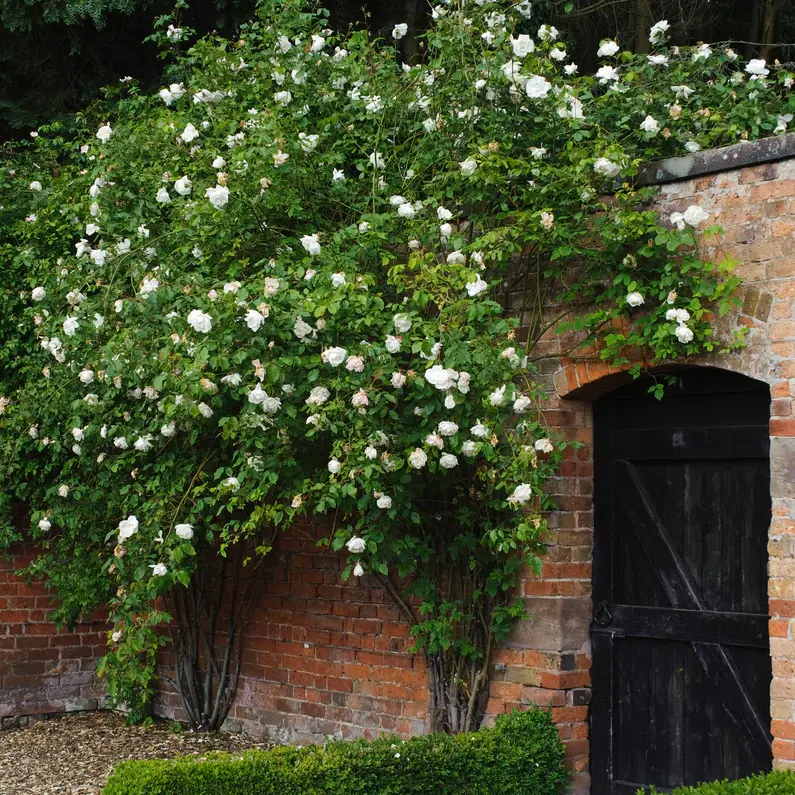 Introduced by Schwartz in 1879, Rosa 'Mme. Alfred Carrière' is a majestic climbing rose that has stood the test of time with its elegant, cupped, creamy white flowers that are delicately tinged with pink. This variety is cherished for its strong, sweet, and fruity fragrance and its ability to repeat flower from June/July until late in the season, ensuring a garden full of beauty and scent for many months. The growth is strong, bushy, and upright, featuring plentiful foliage. While the stems are rather stiff, with careful training, they can be encouraged to create a graceful display, making it an excellent choice for covering large structures, including arbours, pergolas, and even into large trees. 'Mme. Alfred Carrière' thrives in a variety of conditions, from full sun to partial shade, and is adaptable to all soil types, making it a versatile addition to any garden.