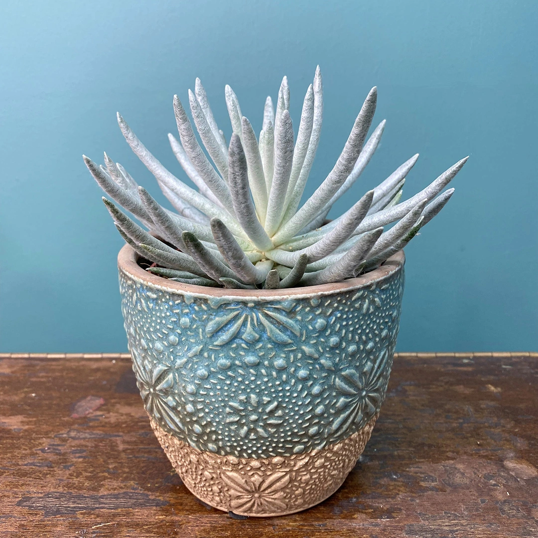 The wooly Senecio prefers a bright sunny spot for optimum growth. Allow your plant to dry between watering as they can rot if overwatered. This beautiful succulent makes a fantastic gift and an unusual addition to the house.