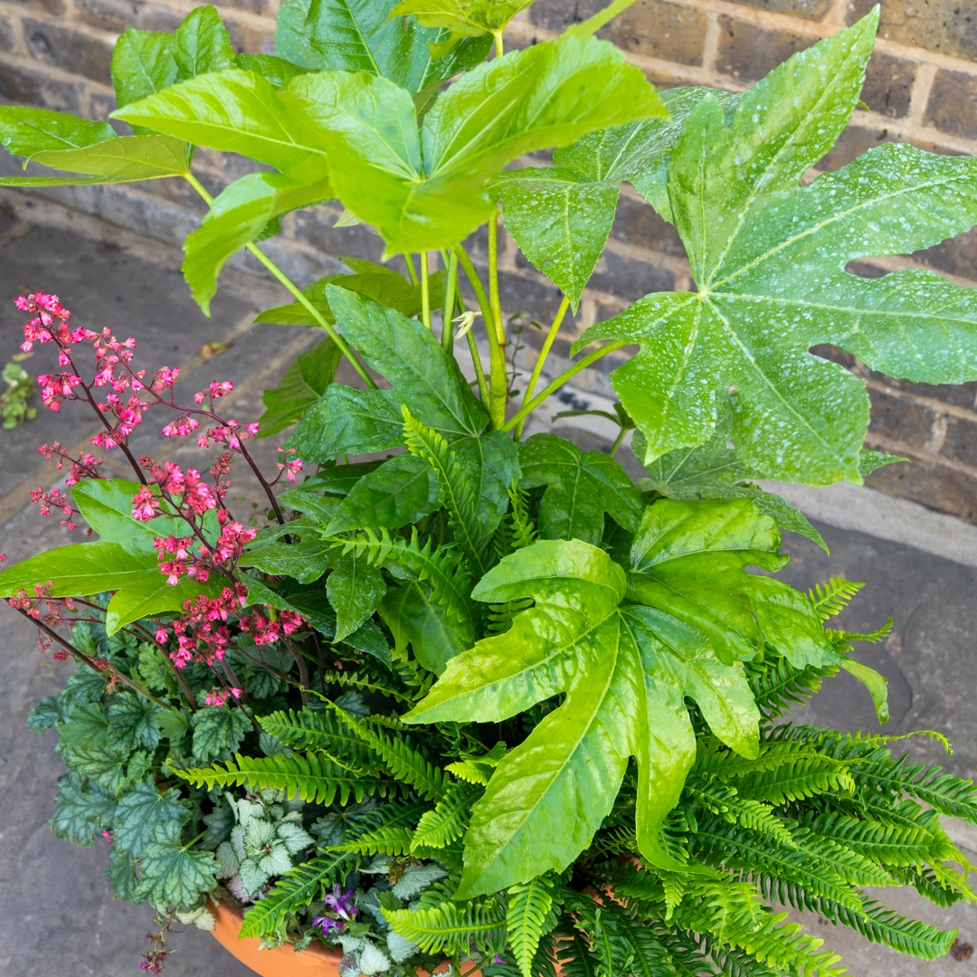 The Shady Jungle Planter Extra Large brings the calming drama of a leafy understorey into urban patios and sheltered gardens. Planted in a classic 39cm terracotta pot, this arrangement overflows with richly textured greenery and splashes of colour, making it a standout for shaded spots. Plants such as Fatsia japonica offer bold, tropical-style leaves, while Heuchera varieties provide silver-veined foliage and upright pink flowers that sway above the mound. Polystichum or other hardy ferns bring a woodland softness, paired with trailing accents like Muehlenbeckia or Lamium with silver-and-green leaves and delicate purple blooms. Together, they create a lush and cooling display perfect for shady corners from summer through autumn.