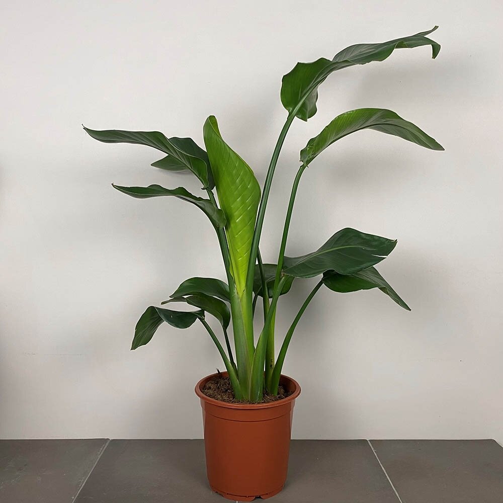 Strelitzia nicolai is the cousin of the famous Bird of Paradise (Strelitzia reginae), South African natives. They are practically identical except for their signature flowers- S. reginae producing vibrant orange ones whereas Strelitzia nicolai very unusual blue and white. Strelitzias, are primarily bought for their tropical-looking foliage, being scarce to blossom outside the wild or in a glasshouse. Bird of Paradise is super easy to care for and are an actual statement plant as it can reach heights of roughly 3m indoors. A warm, bright room and your Strelitzia will thrive!