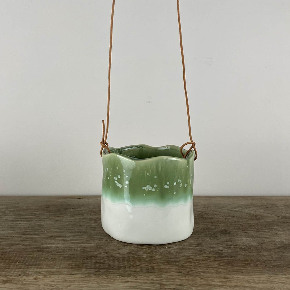 A unique handmade indoor hanging plant pot with a wave edged design. With two-tone Sea-green and white colours, the pot has an authentic hand painted bubble effect. Made to a high-quality with a hand-glazed finish.