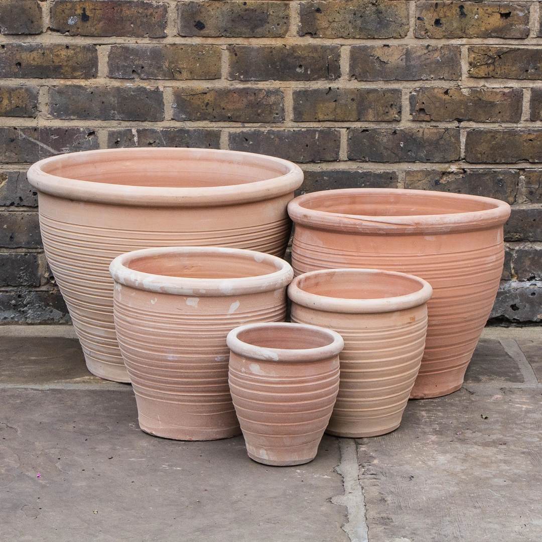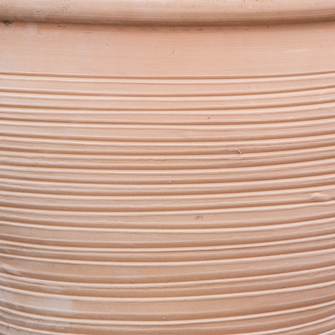Made from natural terracotta, each pot is slightly unique, showcasing subtle variations in tone and surface that add authentic character. The softly ribbed design not only enhances its visual appeal but also provides a pleasing contrast to foliage and flowering plants.